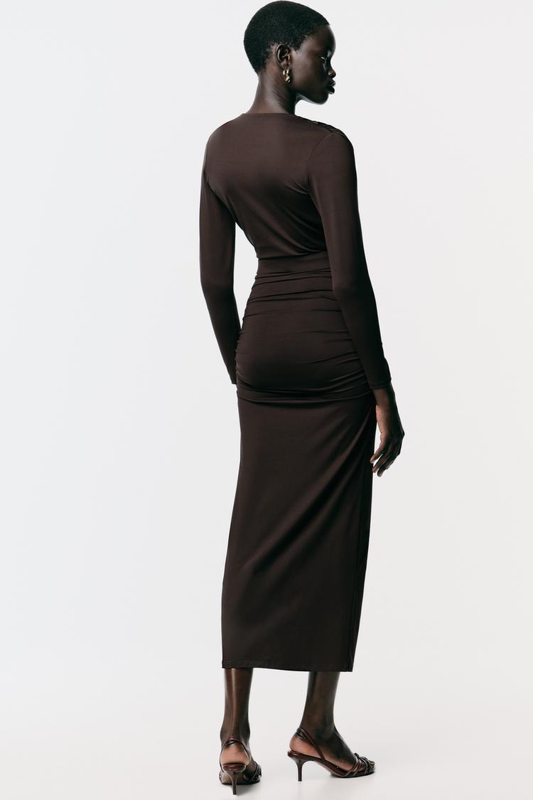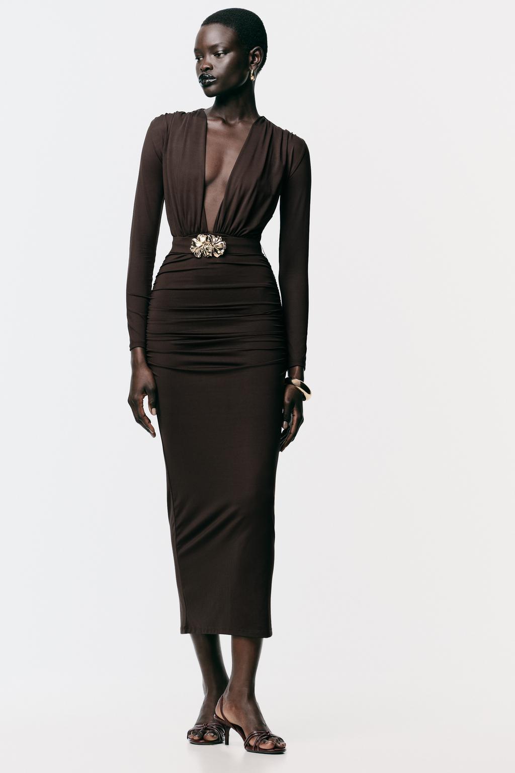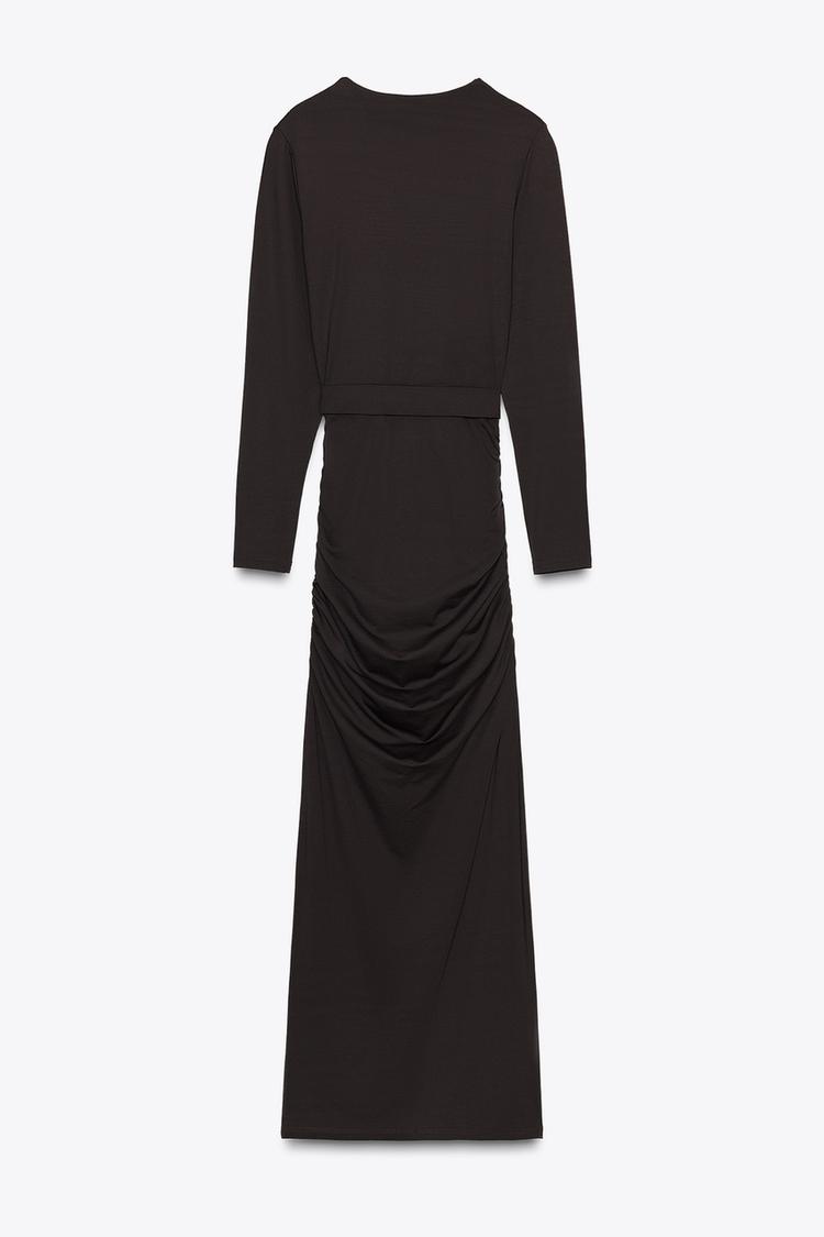 Φόρεμα από πλεκτό μείγμα πολυαμιδίου. V ντεκολτέ και μακρύ μανίκι. Σχέδιο ζώνη από ασορτί ύφασμα με ανάγλυφη