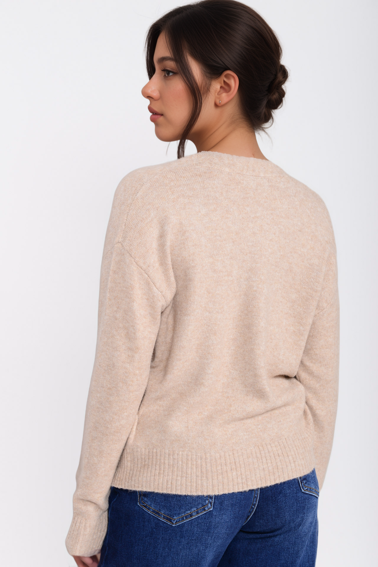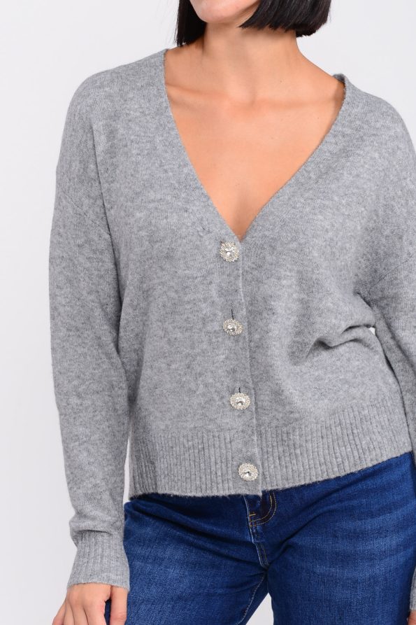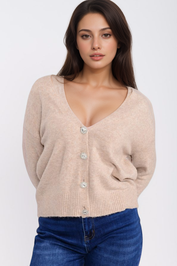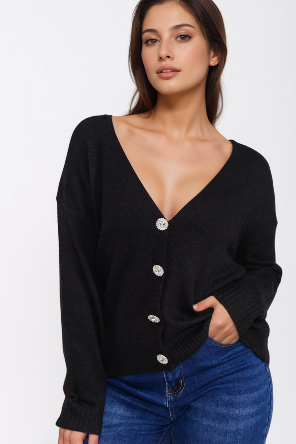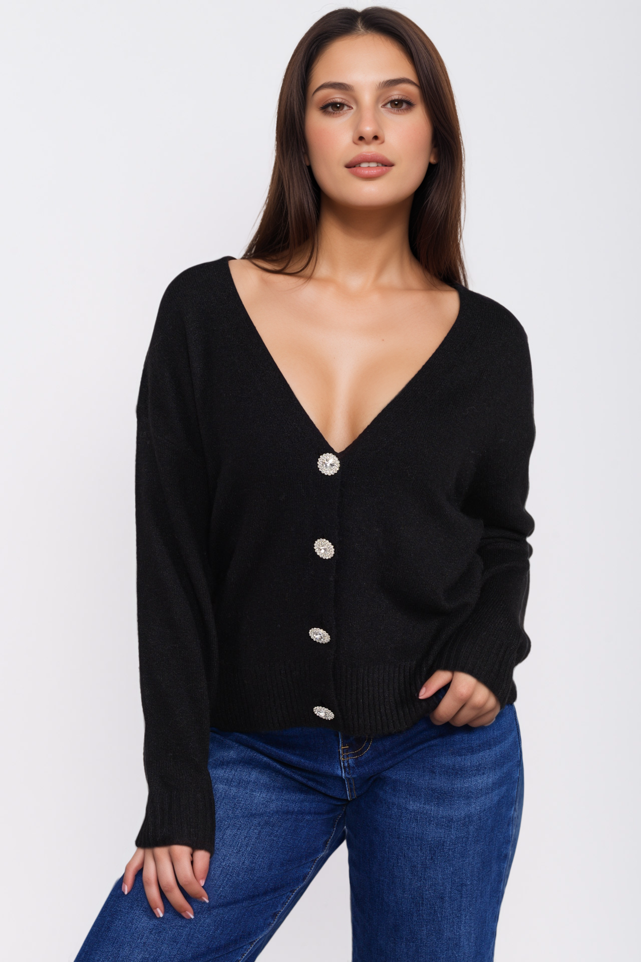 Πλεκτή ζακέτα με κουμπιά diamond, με V λαιμόκοψη και λεπτή πλέξη. Έχει άνετη γραμμή, κανονικό μήκος και διαθέτει ελαστικότητα, καλύπτει μεγέθη από small έως και xlarge. Έχει τέλεια εφαρμογή που κολακεύει κάθε σωματότυπο, μπορεί να φορεθεί εκτός από ζακέτα και σαν μπλούζα, για ένα πιο στυλάτο look. Η λεπτομέρεια στα κουμπιά δίνει μία glam διάθεση που αναβαθμίζει κάθε καθημερινή σου εμφάνιση, ντύσου κομψά και άνετα με ένα μόνο ρούχο.