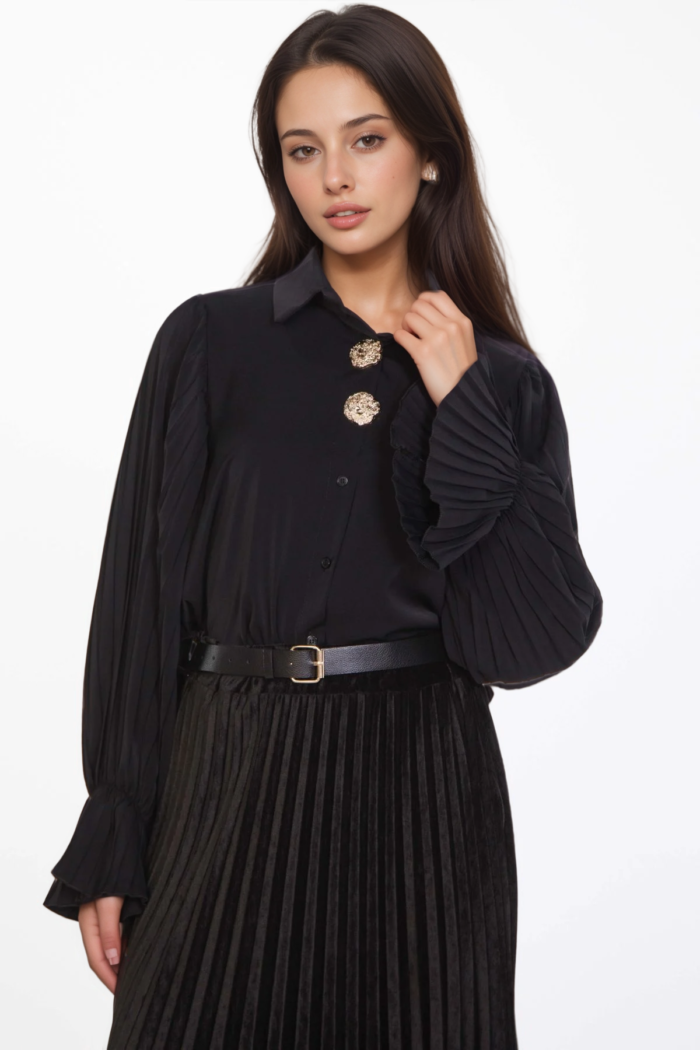 Πουκάμισο σε μονοχρωμία, διαθέτει γιακά, κουμπιά σε χρυσή απόχρωση και μακριά μανίκια με όγκο που καταλήγουν σε τελείωμα καμπάνα. Προσφέρει θηλυκό και elegant αποτέλεσμα. Ιδανική επιλογή για chic καθημερινές αλλά και πιο βραδινές εμφανίσεις.