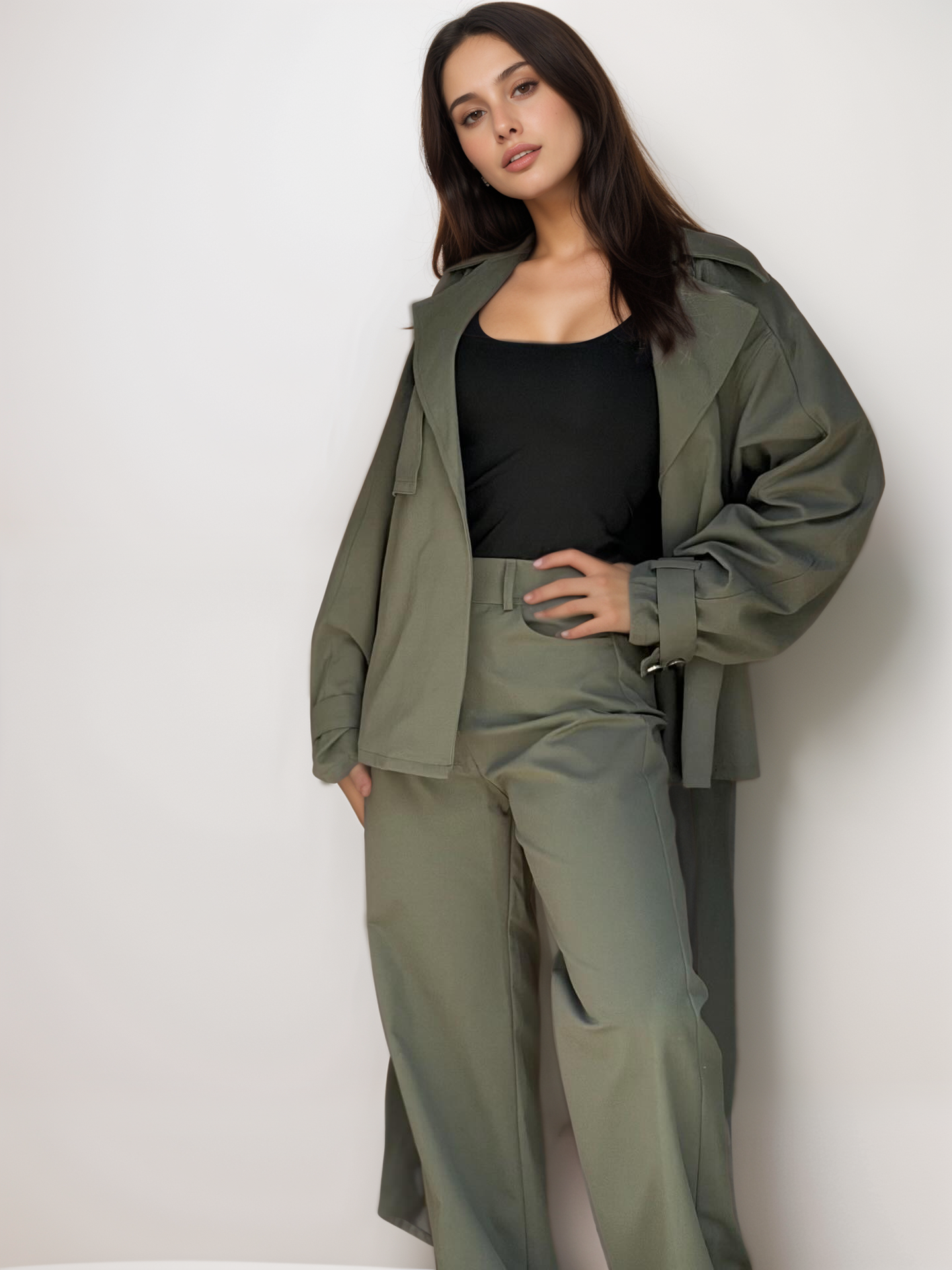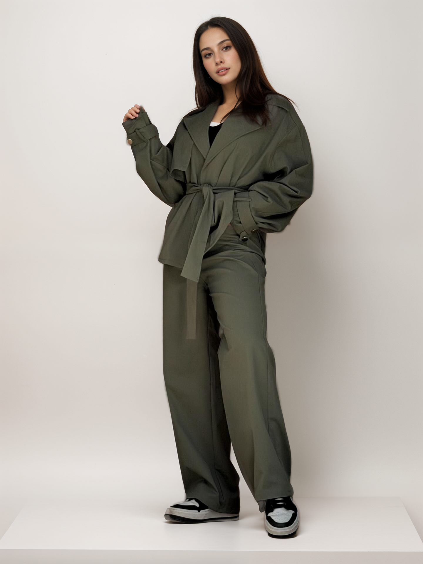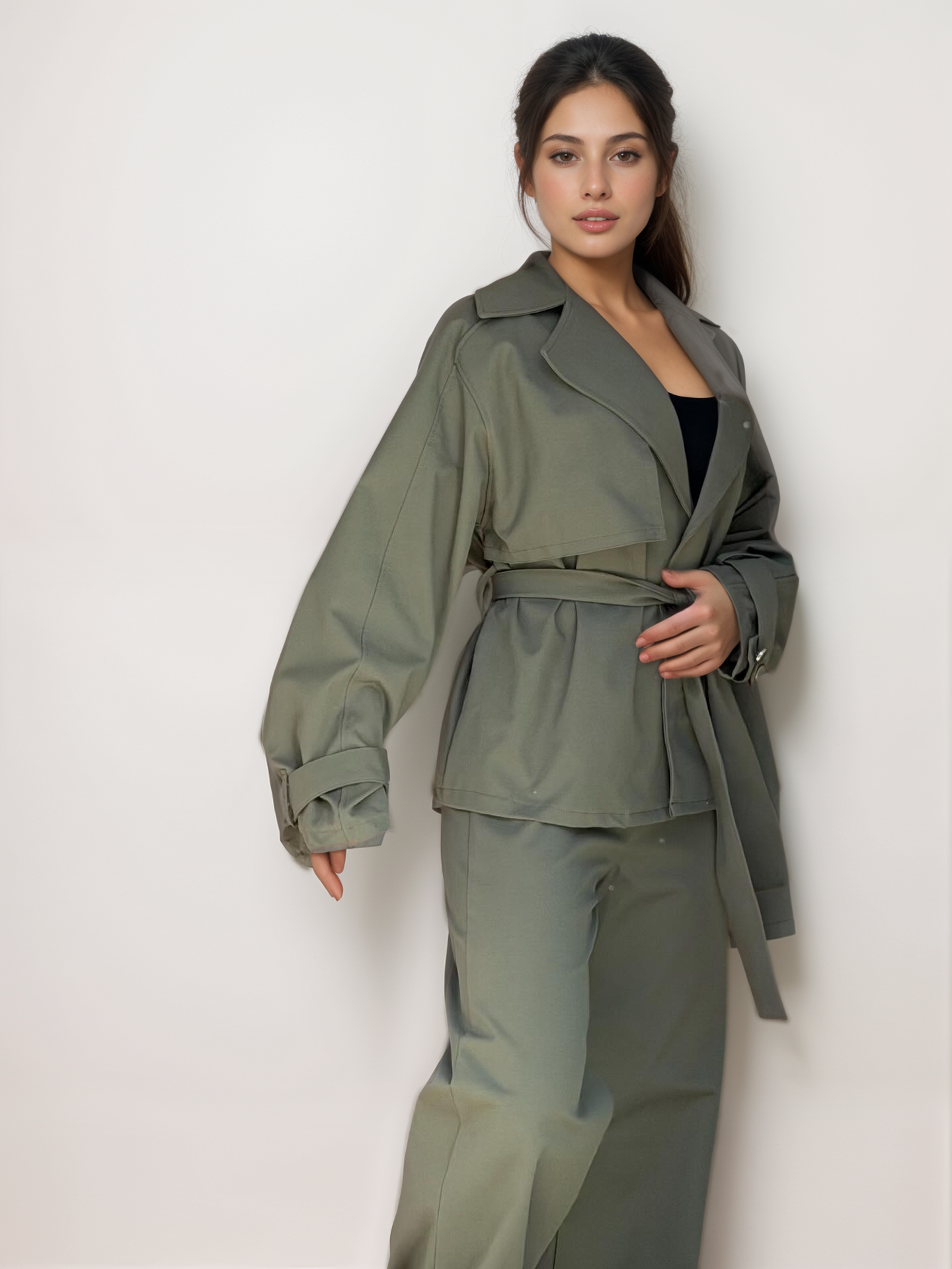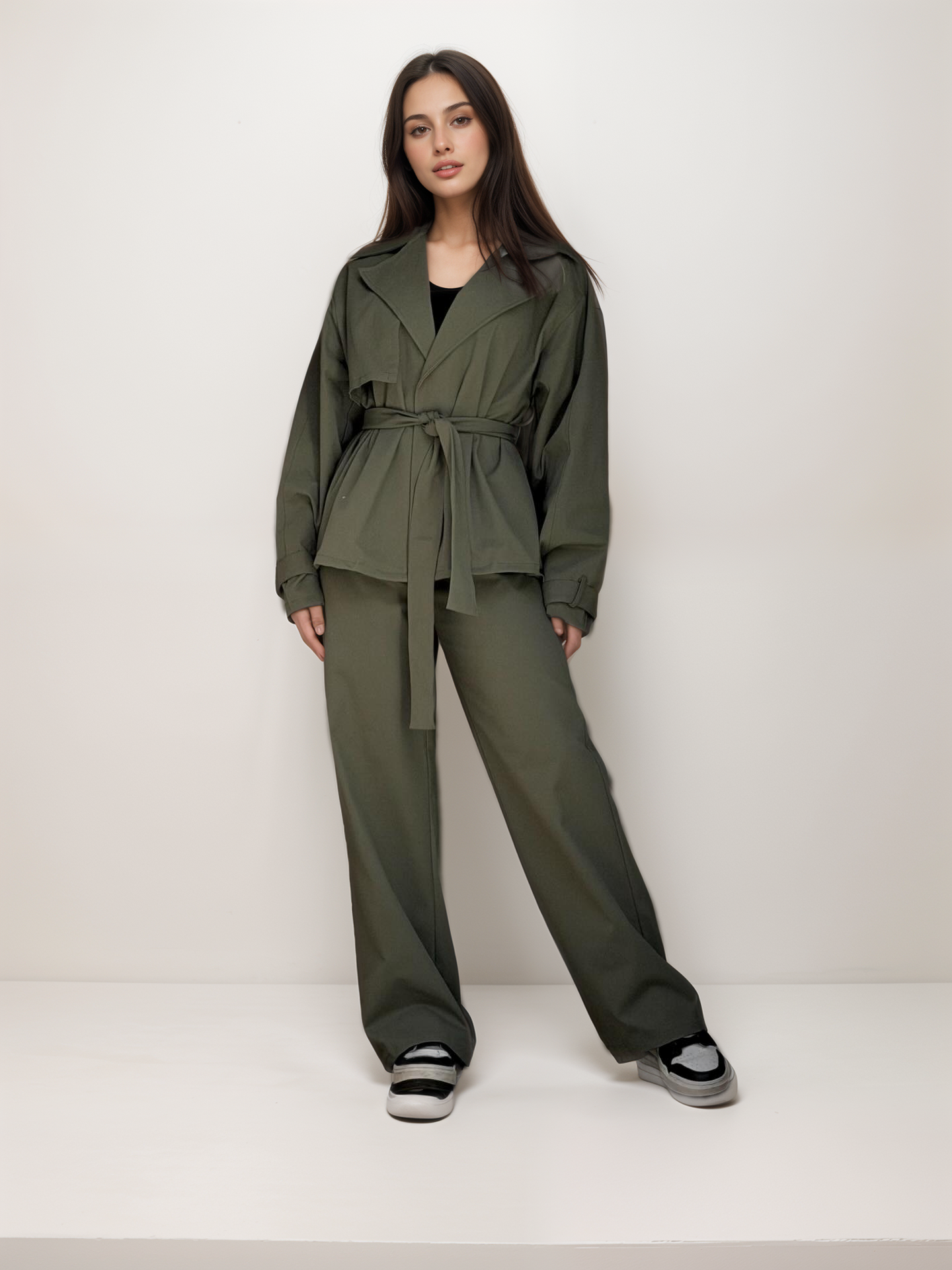 Σετ με τζάκετ σε κανονική γραμμή, που κλείνει με ζώνη ίδιας ύφανσης, χωρίς φόδρα και παντελόνι ψηλόμεσο, ισόφαρδο με λάστιχο στη μέση και τσέπες στο πλάϊ, κλείνει με κουμπί και φερμουάρ.