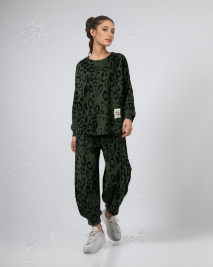 Oversized Λεοπάρ Σετ, Φούτερ Και Ασύμμετρο Παντελόνι Jogger Χρώμα Λαδί