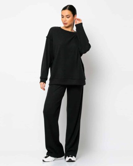 Σετ Μπλούζα-Παντελόνι Ψιλό Πλεκτό Ριπ Με Εξωτερικές Ραφές Χρώμα Μαύρο