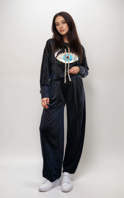 Σετ Φόρμα Βελουτέ Μπλούζα Με Παγιέτες Και Παντελόνι Χρώμα Μαύρο